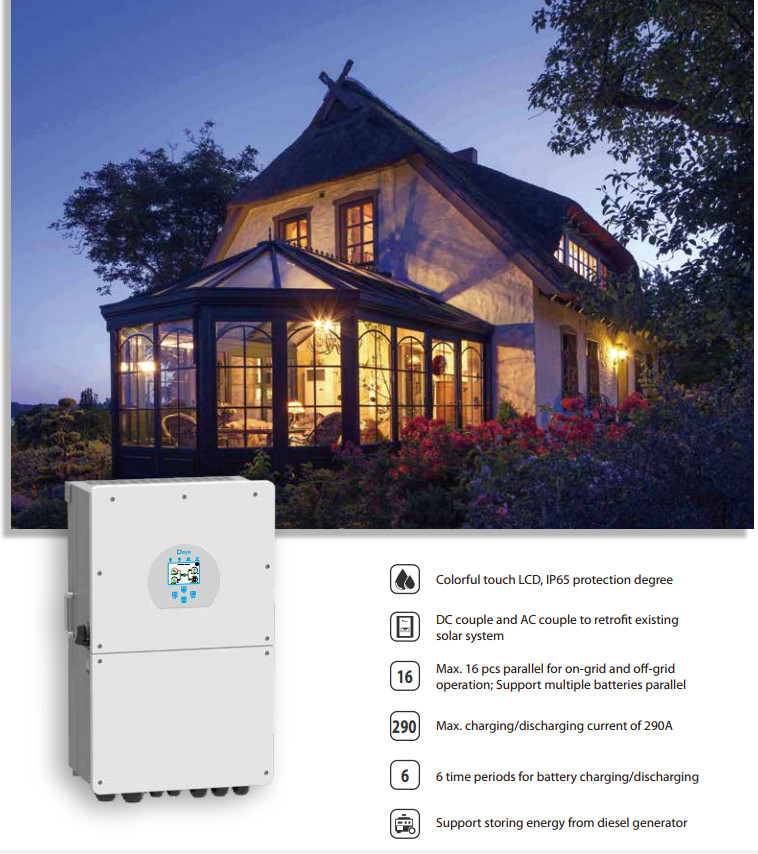 Cung cấp các Inverter Hybrid Deye công suất từ 3,6kW – 20kW, 01 pha & 3 pha Inverter hiệu suất cao 98.9% Dễ dàng lắp đặt. Thương hiệu Top 10 về inverter hòa lưới lưu trữ. Kết nối App dễ dàng theo dõi sản lượng điện trực quan trên Smart phone, máy tính… Bảo hành lâu dài: 5 năm, 10 năm
